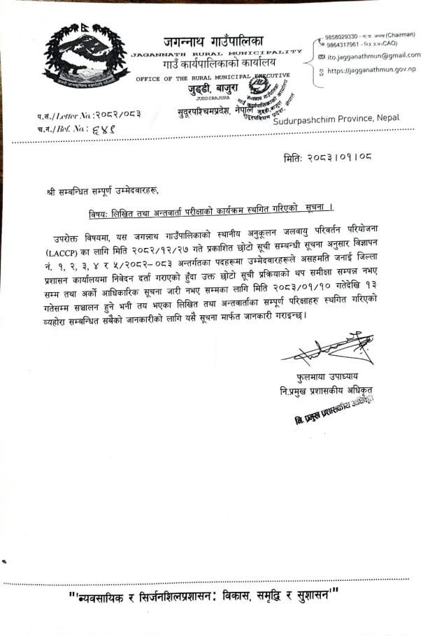 लिखित तथा अन्तवार्ता परिक्षाको कार्यक्रम स्थगित गरिएको सूचना।